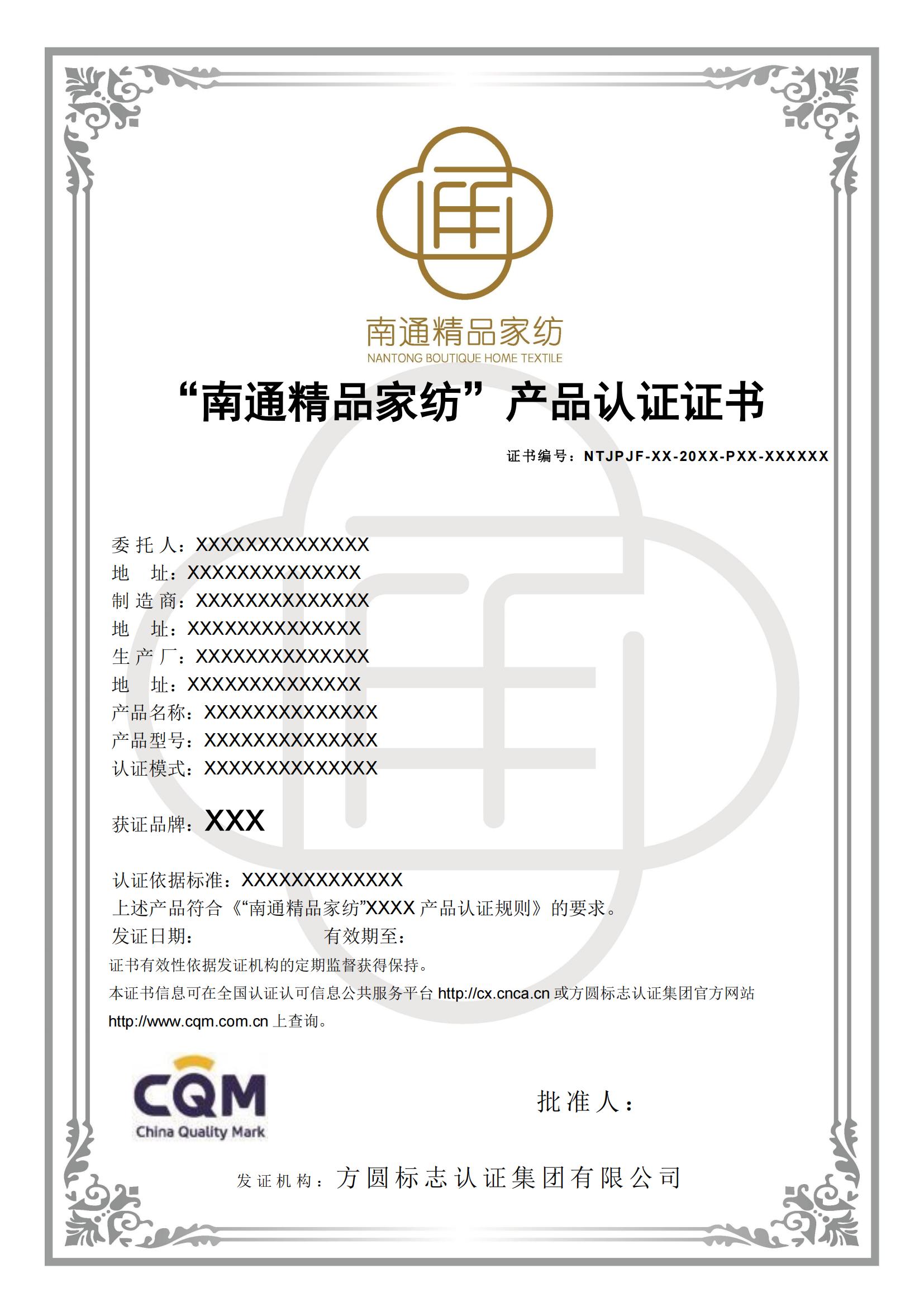 2.“南通精品”證書樣式: