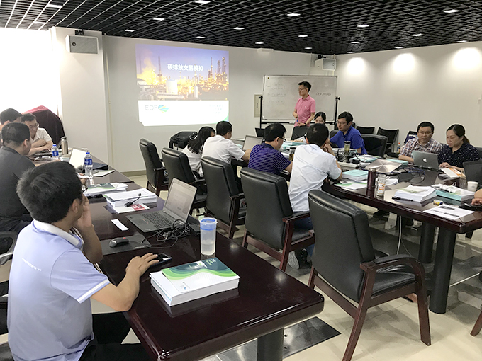 會議上,新興業(yè)務部孫志輝副部長就中國碳市場的整體框架和背景進行了介紹,對碳排放核查業(yè)務的開展程序及主要內容進行了講解;已經成功開展碳核查業(yè)務的廣東公司、福建公司分享了近些年碳核查工作實施的經驗;美國環(huán)保協(xié)會項目主管劉洪銘對氣候變化的影響及碳市場建設發(fā)展情況在會上進行了詳細地介紹,并組織參會成員現(xiàn)場進行了碳交易模擬培訓,使參會人員親身體驗企業(yè)進行碳交易的全流程。