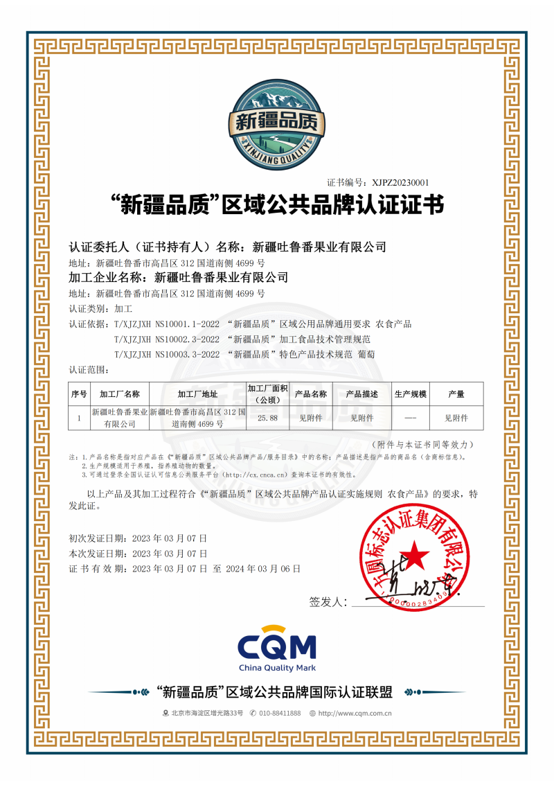 3月7日,“新疆品質(zhì)”區(qū)域公共品牌國(guó)際認(rèn)證聯(lián)盟向新疆吐魯番果業(yè)有限公司頒發(fā)了“新疆品質(zhì)”首張區(qū)域公共品牌認(rèn)證證書。這是方圓標(biāo)志認(rèn)證集團(tuán)積極推進(jìn)“新疆品質(zhì)”區(qū)域品牌建設(shè)以來,新疆頒發(fā)的首張“新疆品質(zhì)”區(qū)域公共品牌認(rèn)證證書,是“新疆品質(zhì)”區(qū)域公共品牌產(chǎn)品的“身份證”。